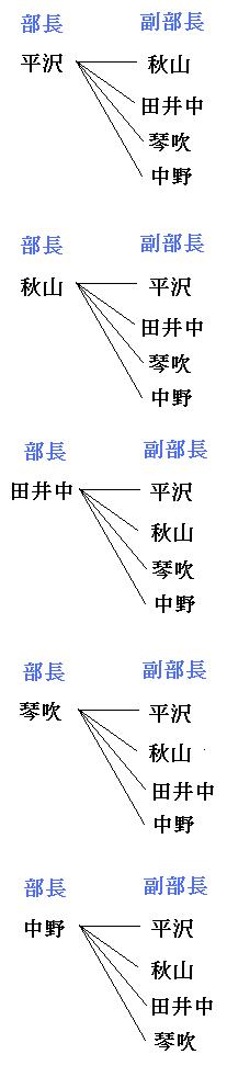 平沢、秋山、田井中(たいなか)、琴吹(ことぶき)、中野の5人の部員がいるとき、次の問に答えましょう。