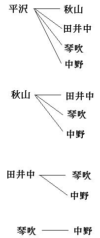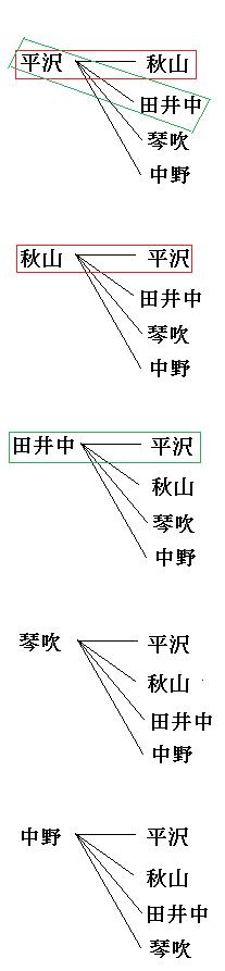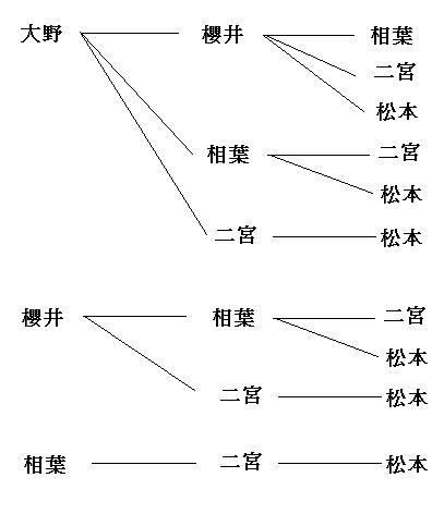 今回は、大野、櫻井(さくらい)、相葉(あいば)、二宮(にのみや)、松本としておきます。(好きな名前をつけて大丈夫ですが、樹形図を書く時に面倒なので、画数の少ないものをおすすめします。a、b、c、d、eが一番おすすめ。)