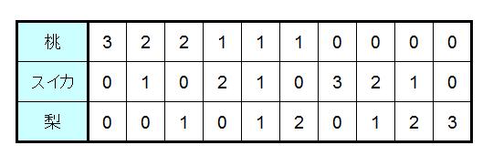 主に果物を使って出題されます。3種類以上の果物が登場して、「全部で○個選びます。何通りの選び方があるでしょう。ただし、選ばないものがあってもよい。」みたいな形で出題されます。