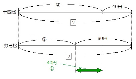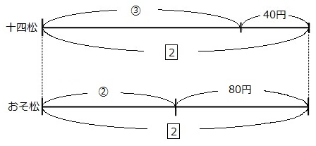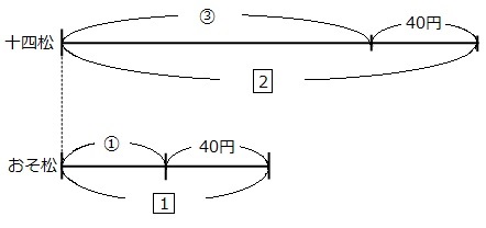 上の線分図(十四松)を1倍、下の線分図(おそ松)を2倍に伸ばして、2で長さを合わせます。