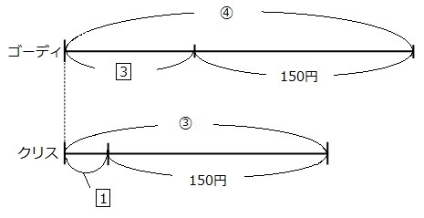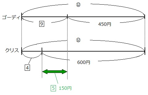 上の線分図(ゴーディ)を3倍、下の線分図(クリス)を4倍に伸ばして、⑫で長さを合わせます。スペースの都合上、本当に伸ばしたものは書けません、ごめんなさい。
