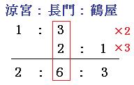 よって、涼宮さんと長門さんと鶴屋さんのジュースの量の比は2:6:3です。それでは線分図を書いてみましょう。