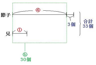 で、①が6個にあたることがわかりました。節子の線分図を見てみると、④よりも3個ぶん長いので、