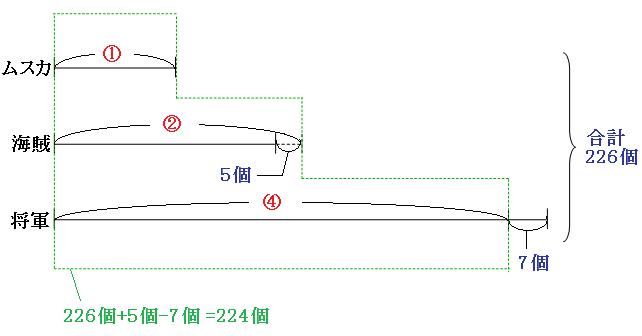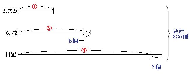 で、①が32個にあたることがわかりました。将軍の線分図を見てみると、④よりも7個ぶん長いので、