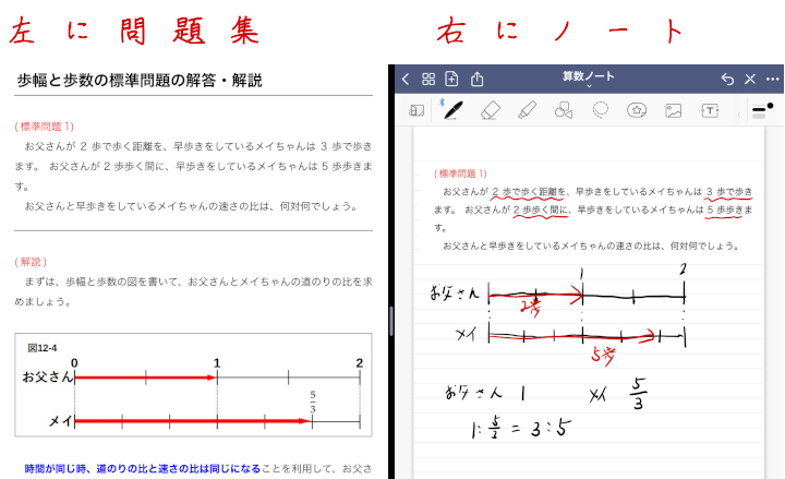 タブレットであれば、画面の左半分に問題集、画面の右半分にノートアプリを表示させることができます。1台で問題集としても、ノートとしても使えます。