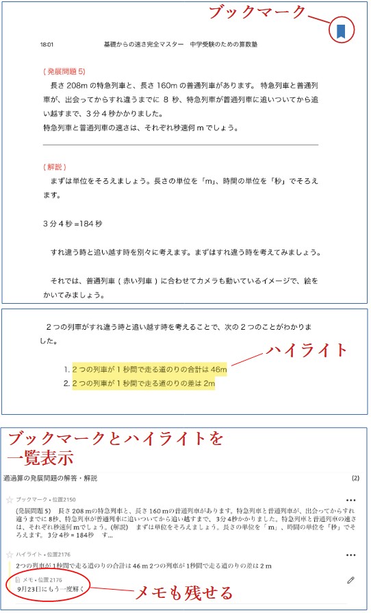 Amazonの電子書籍であるKindleは、ページをブックマークしたり、文字にハイライトをつける(本にマーカーを引くイメージ)ことができます。