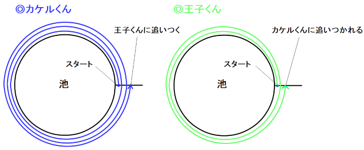 カケルくんが王子くんを追い抜いたということは、カケルくんが王子くんを一周遅れにしたということです。