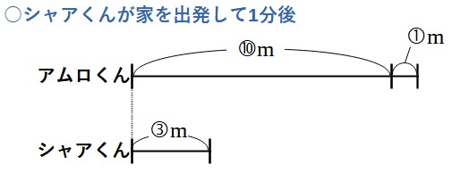 この事を利用して、シャアくんの速さを「分速③m」、アムロくんの速さを「分速①m」と置きます。