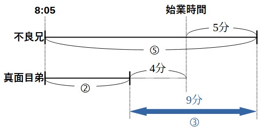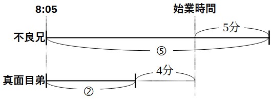 兄は午前8時5分に家を出ているので、始業時間は午前8時15分であったことがわかりました。