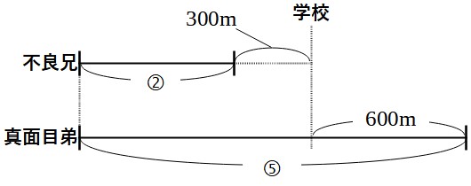 よって、始業時間の時点で、不良兄は学校まであと300mのところにいます。真面目弟は学校の先600mのところにいます。