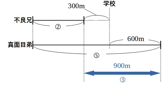 これで、不良兄は家を出てから始業時間までに600m歩いたことがわかりました。この時点で学校まであと300mのところにいることを考えて、家から学校までの道のりを求めます。