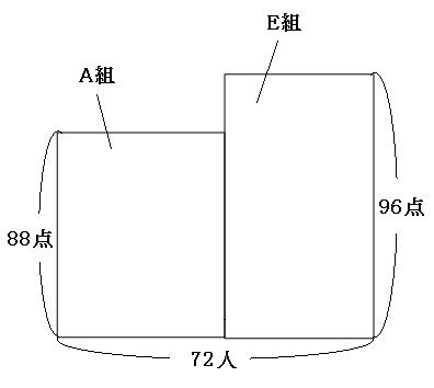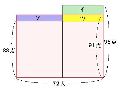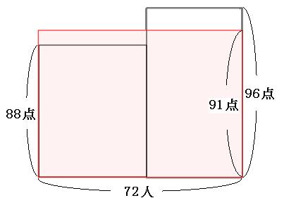問題文に2種類の平均と合計の平均が出てきたので、面積図を使って考えてみます。 たてを平均、横を人数、面積を合計点に置きかえます。
