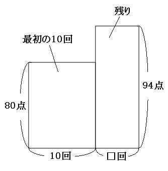 まずは、最初の10回のテストの面積図と、残りのテストの面積図を並べて書きます。残りのテストを受けた回数がわからないので、横の長さは適当に書いておきます。
