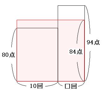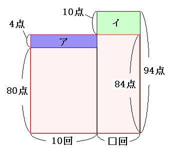 問題文に2種類の平均と合計の平均が出てきたので、面積図を使って考えてみます。 たてを平均、横を受けたテストの回数、面積を合計点に置きかえます。