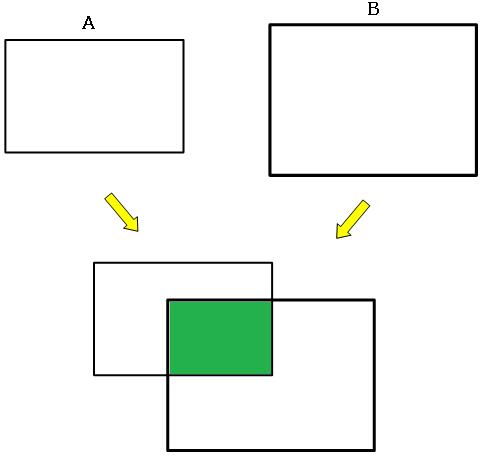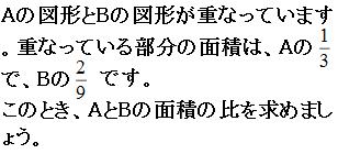分数が出てきましたが、連比の考え方を使って求めていきます。まずは「A全体の面積:重なっている部分の面積」と、「B全体の面積:重なっている部分の面積」を求めましょう。