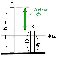 (2)AとBの長さの差が204cmのとき、水の深さは何cmでしょう。