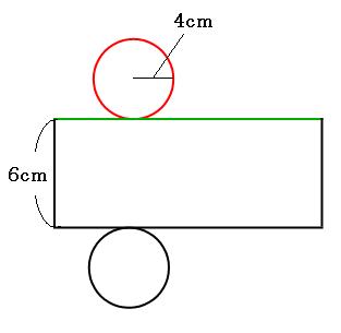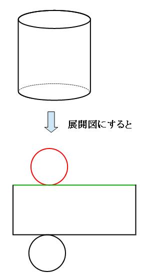 が、底面の円周(上の図の赤い部分)と、側面を開いた長方形の横の部分(上の図の緑の部分)は、もともと同じ所だったので、長さは同じです。