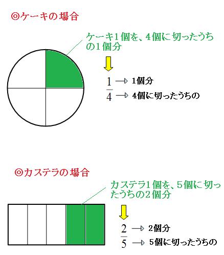 分数とは、「1つの物を、何個に切ったうちの何個分」と表すことができる数字です。はじめのうちは、分数が出てくるたびに「何個に切ったうちの何個分」と頭の中で考えて、だいたいどれくらいの大きさの数なのか想像するようにしましょう。 実際に絵を書いて考えてもよいと思います。想像するものは、ケーキでもカステラでもうまい棒でも大丈夫です。