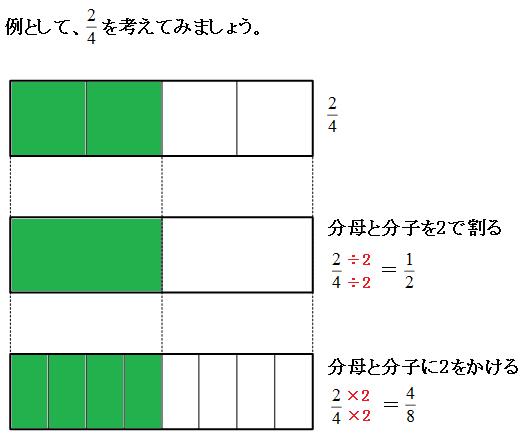 分数には、「分母と分子に同じ数をかけ算しても、同じ数でわり算しても、大きさは変わらない」という性質があります。