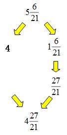 このままでは、分子は「6-7」になってしまい。計算できません。そこで、帯分数を仮分数にする方法を使って工夫をします。(帯分数を仮分数にするやり方はこちらへ)