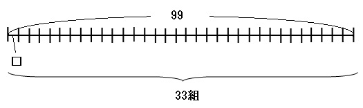 元の式「□×33=99」のイメージは、「□個のものを33組用意すると、全部で99個になった」という感じです。これを線分図に表すと下のようになります。