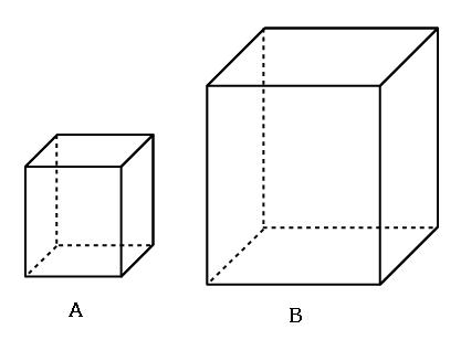 直方体Aと直方体Bの辺の長さの比(相似比)は1:2です。よってふたつの直方体の体積比は、