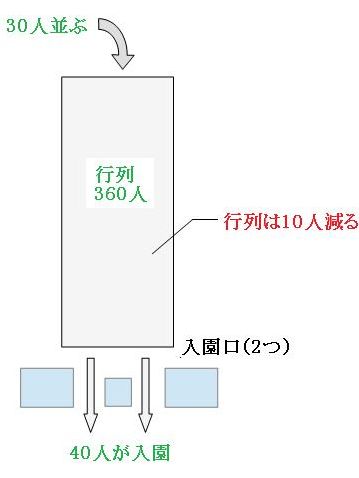 よって、1分で10人ずつ行列から人が減っていくことになります。 列は1分で30人ずつ増えていくのに、実際には10人ずつ減っていたということは、この1分で40人が入園していったことになります。最初の1分間の状況を図で書くと、下のようになります。