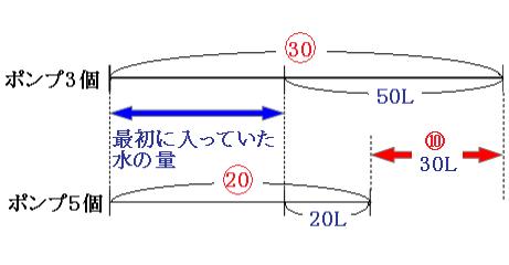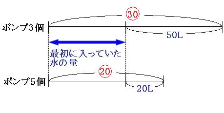 水そうに最初に何L入っているかがわかリません。最初の状況がわからない場合は線分図を書いて考えるのですが、その前に、水そうが空になるまでにしたポンプの仕事を考えてみましょう。