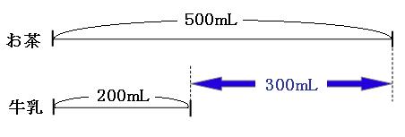 300mL多いということが、目で見てわかります。もちろんこんな単純な文章ならば、線分図を書かなくても「500mL-200mL」という式を作れると思いますが、複雑な文章が出た時のために、線分図はしっかりと書けるようにしておきましょう。