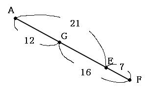 ここで線分AFだけ抜き出して書いてみます。ここまでで求めた、EA:EF=3:1と、GA:GF=3:4も書き込んでみます。