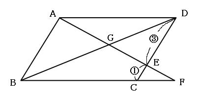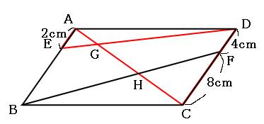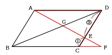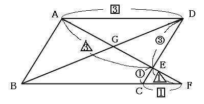 この赤いチョウチョは、辺AEと辺CDが平行なので(←四角形ABCDが平行四辺形だから)、三角形GAEと三角形GCDが相似になっています。
