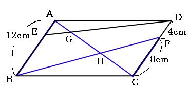 なお、四角形ABCDは平行四辺形なので、辺ABの長さと辺CDの長さは同じです。よって、辺ABの長さは12cmです。これをふまえた上で、下の図の青いチョウチョに注目します。