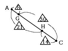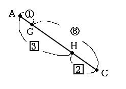 ここで線分ACだけ抜き出して書いてみます。ここまでで求めた、AG:CG=1:6と、AH:CH=3:2も書き込んでみます。