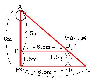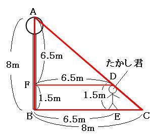 よって、BCの長さは8mです。たかし君の影の長さはECの部分なので、