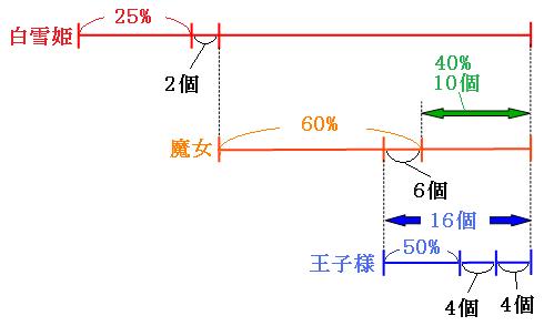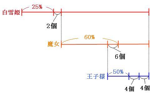 まずは一番下の青い線分図に注目していきます。線分図を見て、割合とりんごの個数の両方がわかりそうな部分を探します。