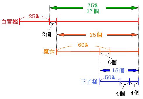 よって、オレンジ線分図の長さは25個です。同じように考えて、一番上の赤い線分図を考えてみましょう。