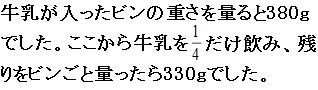 よって、はじめの牛乳の重さは200gです。ビンの重さは、
