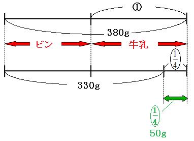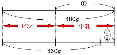 線分図を書いて考えましょう。はじめの牛乳の重さを①(もとにする量)とします。
