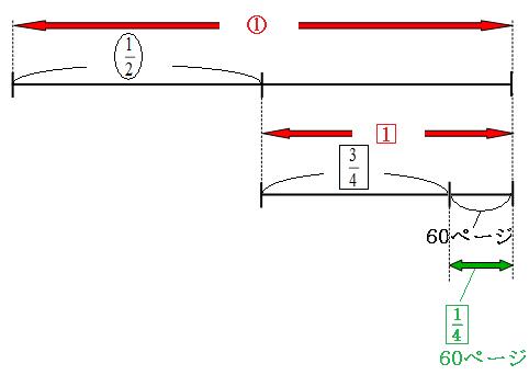 線分図を書いて考えましょう。この問題には、もとにする量が2つ出てきました。この本全部のページ数を①、1日目に読んだ残りのページ数を1とします。
