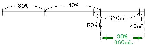 30%が360mLにあたることが分かりました。最初に牛乳パックに入っていた牛乳の量(もとにする量)を求めましょう。