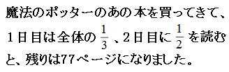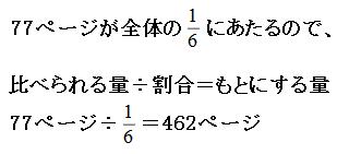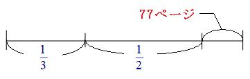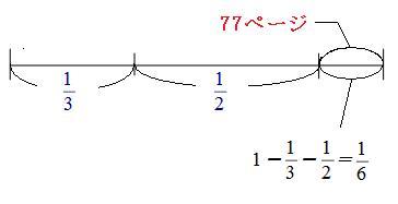 線分図の中で、実際のページ数が出ているのは「77ページ」の部分しかありません。なので、まずはこの部分の割合を求めます。 本全体が①にあたるので、
