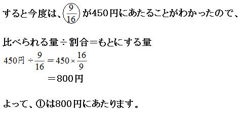線分図を書くのは、これまでほど難しくありません。「線分図のどこに注目すればいいか」が、人によっては見つけにくいようです。 コツは、割合も数量も両方わかっているところを探すことです。 言うまでもなく割合の計算がバンバン出てくるので、不安な人は復習してきましょう。(割合についてはこちら)