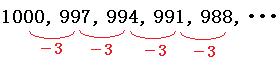 等差数列のN番目の数を求める公式は、初めの数に公差を(N-1)回足すから「初めの数+公差×(N-1)」でした。今回は初めの数から3を(N-1)回引くことになります。 なので、今回使う公式は、