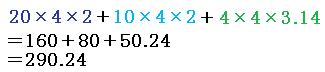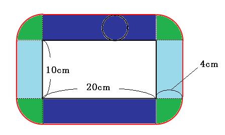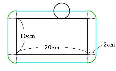 求める面積は、水色の長方形(2つ)と、青色の長方形(2つ)と、緑色のおうぎ形(円1個分)を合わせた面積です。