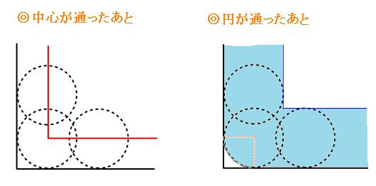 円が図形の内側を転がるとき、角の部分は、円が通ったあとの隅っこはおうぎ形に、内側はポッキリと折れ、円の中心が通ったあとはポッキリと折れます。
