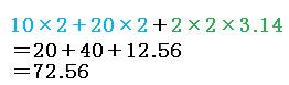 求める長さは、水色の直線部分(4本)と、緑色のおうぎ形部分(円1個分)を合わせた長さです。