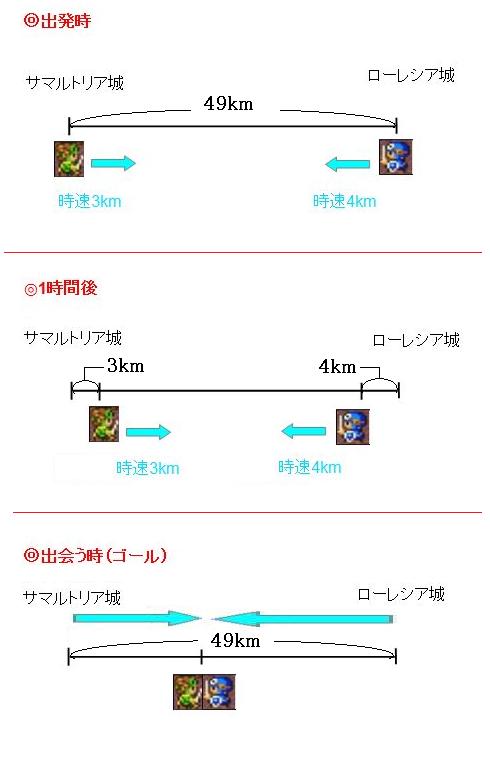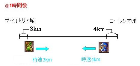 サマルトリア城からサマルトリアの王子が、ローレシア城に向かって時速3kmで、ローレシア城からローレシアの王子が、サマルトリア城に向かって時速4kmで、同時に歩き始めました。