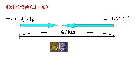 出会うまでに歩いた時間が分からないので、2人それぞれが歩いた道のりは分からないのですが、2人が歩いた道のりの合計は図を見ればわかります。 2人が歩いた道のりの合計は49km。サマルトリア城とローレシア城の間の距離と同じです。続いて、2人が歩き始めてから1時間後の状況をもう一度見てみましょう。