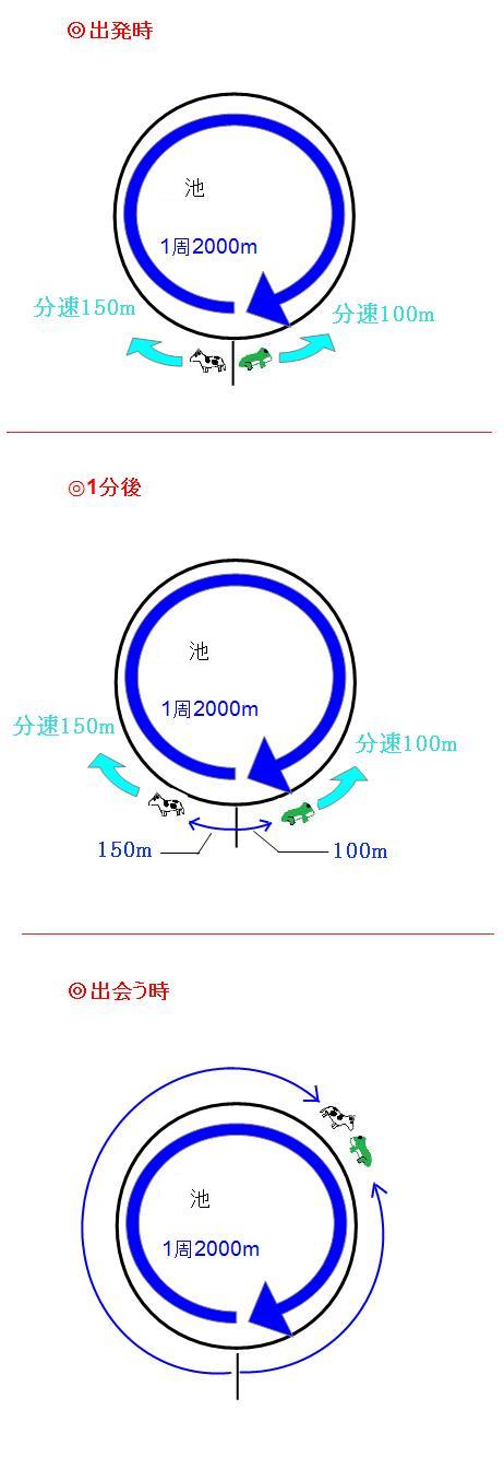 と、覚えてしまう人もいます。こちらも、ただ暗記してしまうのはおすすめしません。 それでは、池の周りを逆向きに回って途中で出会う旅人算をまとめます。