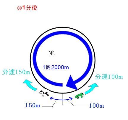 出発時、1分後、出会う時を並べるとこんな感じです。まずは、出会った時の状況をもう一度確認してみます。出会うまでのかかった時間がわからないので、ウシ君とカエル君それぞれが進んだ道のりはわからないのですが、2人(1頭と1匹)が進んだ道のりの合計は図を見ればわかります。 2人(1頭と1匹)が進んだ道のりの合計は2000mです。池1周の距離と同じです。続いて、出発してから1分後の状況を見てみましょう。